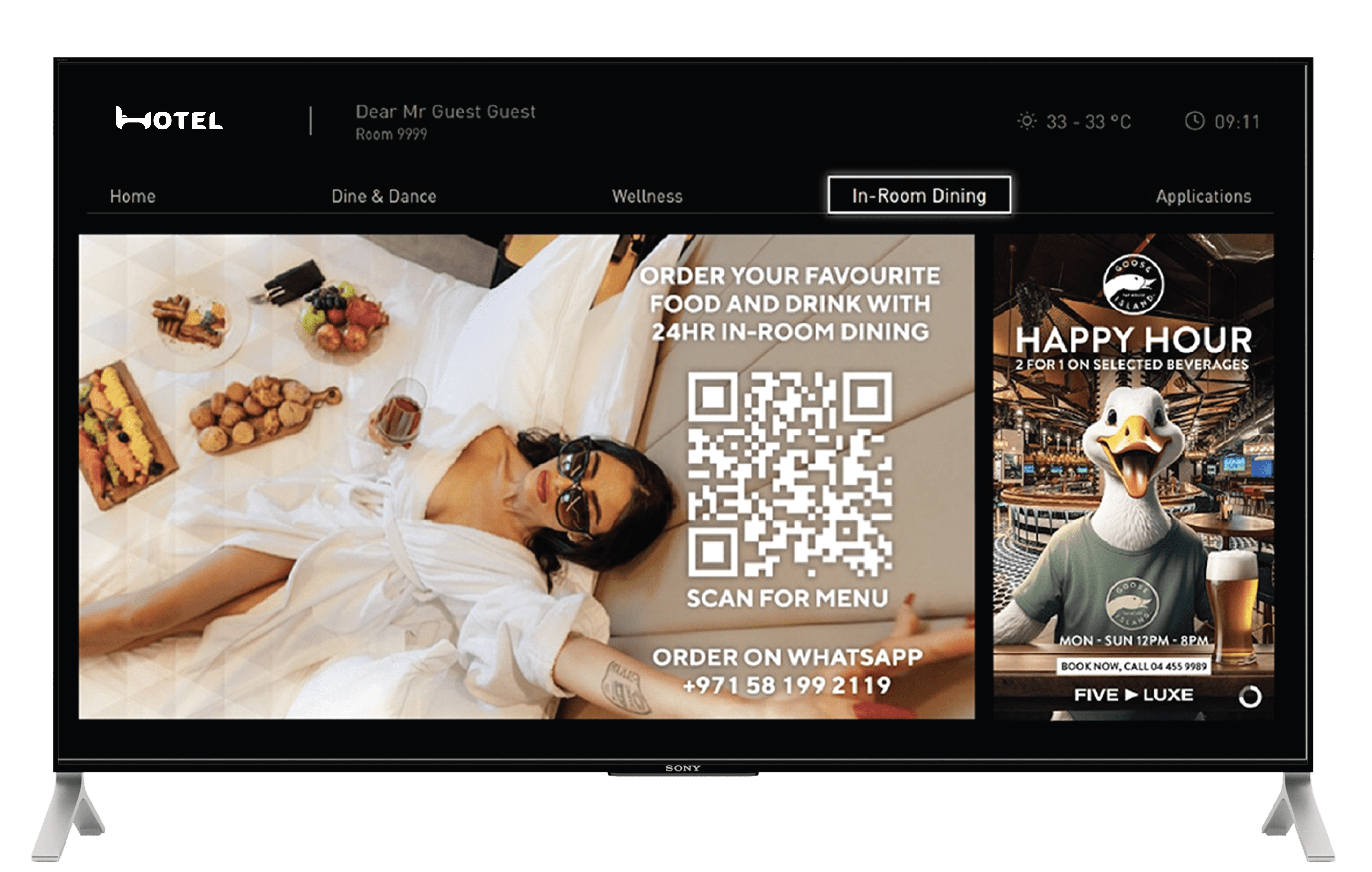 Promote in-house offers, highlight dining specials, and showcase exclusive services directly on-screen. Drive engagement while increasing revenue—turn every guest interaction into an opportunity.